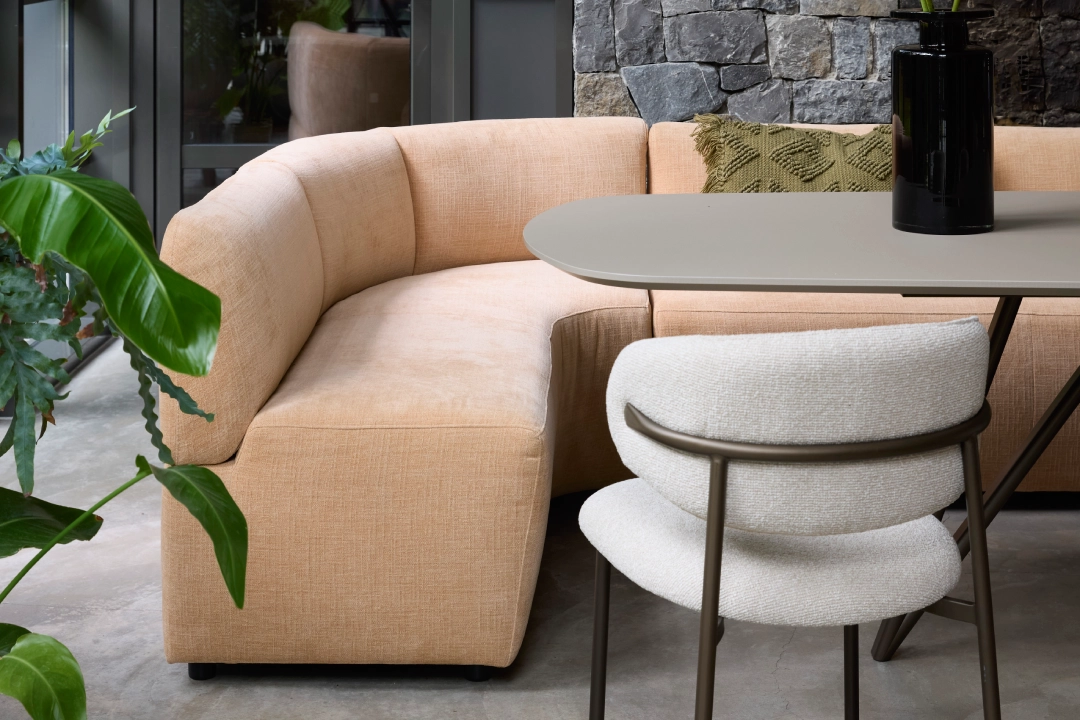 De productgroep eetbanken kenmerkt in veel de eigenschappen van een Dyyk-meubel: daar waar nut en design elkaar vinden. Model Supermoon biedt het comfort waar je naar op zoek bent bij de eettafel. De nette rondingen geven de eetbank de souplesse en sfeer mee. De bank heeft een stevige basis, die door de strakke stoffering nog eens wordt bevestigd. De zachte rondingen nodigen uit tot lang natafelen. Supermoon levert net dat beetje meer in de eetkamer, net dat stukje Dyyk.